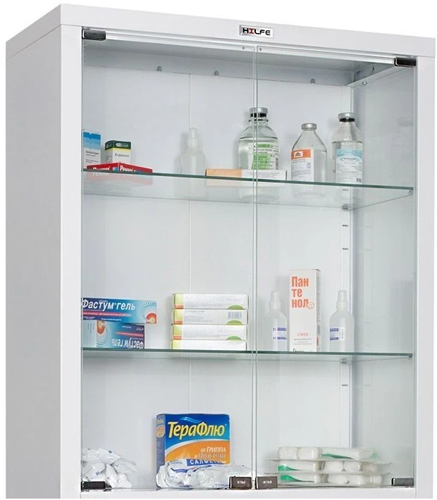 - В каждой секции медицинского шкафа имеются полки. Максимальная нагрузка – до 30 кг на металлическую полку и до 10 кг на стеклянную полку.